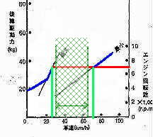 さて、次に変速域のことを考えてみましょう。 上の図は6000rpm、下の図は7000rpmで変速している場合の 回転数と車速の関係です。 よく、「パワーバンド内で変速させる」と言いますが この2つの図を比べてみると低速から高速までの変化で 回転数はどのようになっているかを見てみると 下の図の方が7000rpm付近を使っている速度域が多いのが よくわかると思います。 このマシンの場合、上のセッティングだと7000rpm付近は 70Km/hあたりでやっとパワーバンドに入り、 そのままその回転域を通り過ぎていくことが判ります。 一方下の図では、20Km/hを越えたところから70Km/hまで ずっと7000rpmを保っていることが判ります。 つまり、実際の走行に置いて、変速することによって 広い速度域でパワーバンド内に収まるというわけです。 |